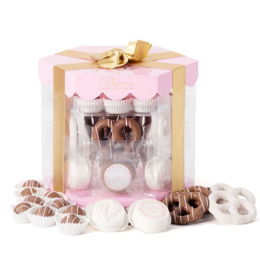 Whether you're welcoming a newly born baby or congratulating an expecting couple, our Selection Box is the sweetest gift to celebrate! Featuring an assortment of chocolate covered Oreos, pretzels and our delicious Biens striped in a beautiful shade of light pink.