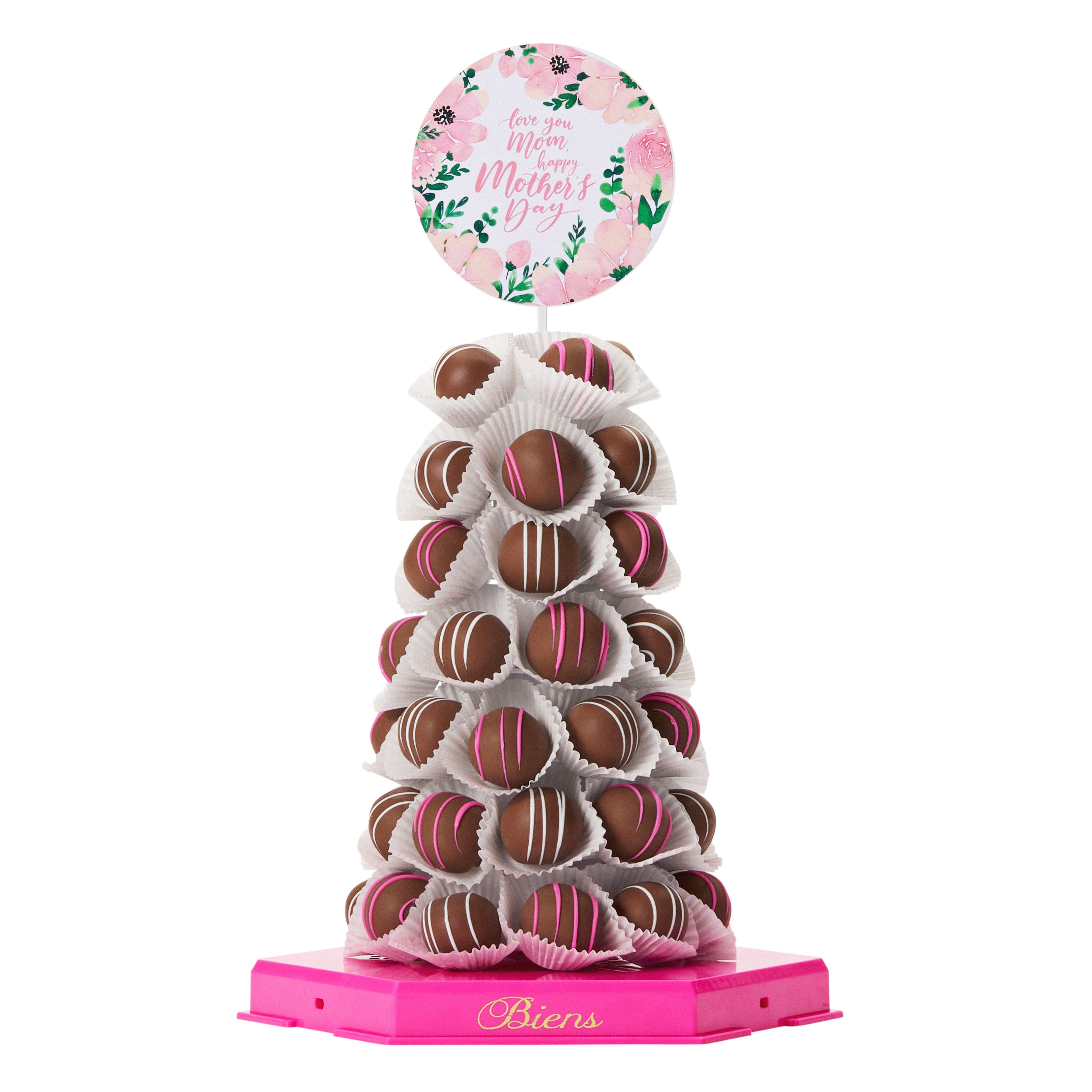 A Mom loves you first and then forever! Show Mom how much she means to you this Mother's Day with a gift that Towers over all the rest- literally! Featuring 50 incredible chocolate cake truffles hand striped in a beautiful shade of light pink chocolate!