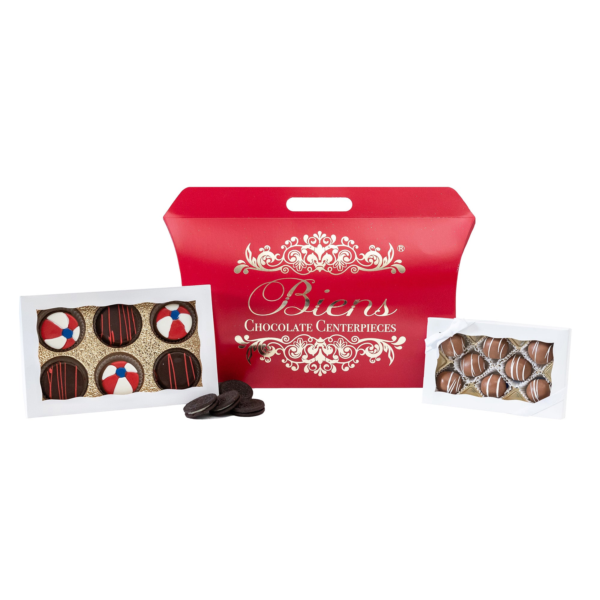 Delight in our Beach Ball Custom Oreo Purse Box, a magical treat that captivates with its delicate charm. Each box encases six handcrafted chocolate-covered Oreos and our signature Biens. Ideal for summer lovers or as a unique gift to spread wonder and joy, these gourmet cookies are as visually stunning as they are delectably satisfying.