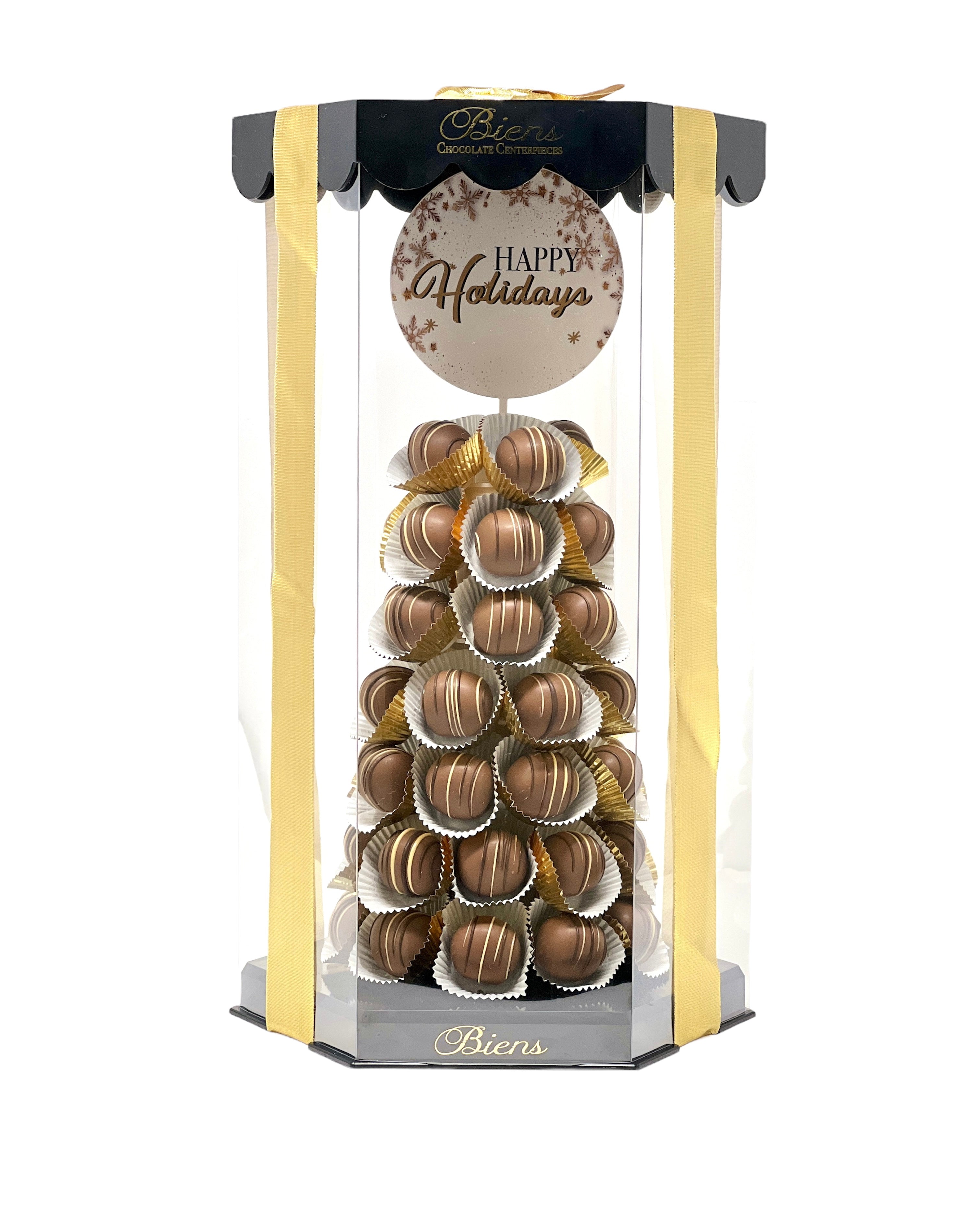 Nothing rings in the Holidays quite like decadent chocolate cake truffles! Send your Holiday best wishes with the best truffles they’ll ever taste on a one of a kind patented Tower display! Ships fully assembled and ready to enjoy for the ultimate festive treat! Our Bien Towers are a delicious way to celebrate the season!
