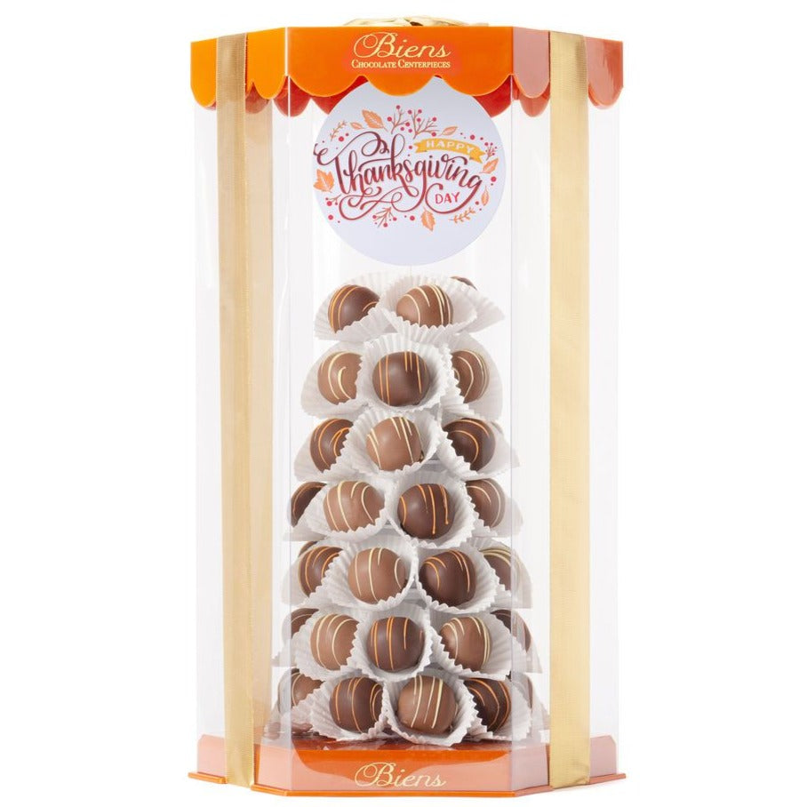 Look at this bounty of Biens! 50 pieces of pure decadence perfect for bringing as a hostess gift this fall. Dipped in milk chocolate and striped in seasonal colors, our Fall Harvest Tower will look great on any indoor or outdoor table!