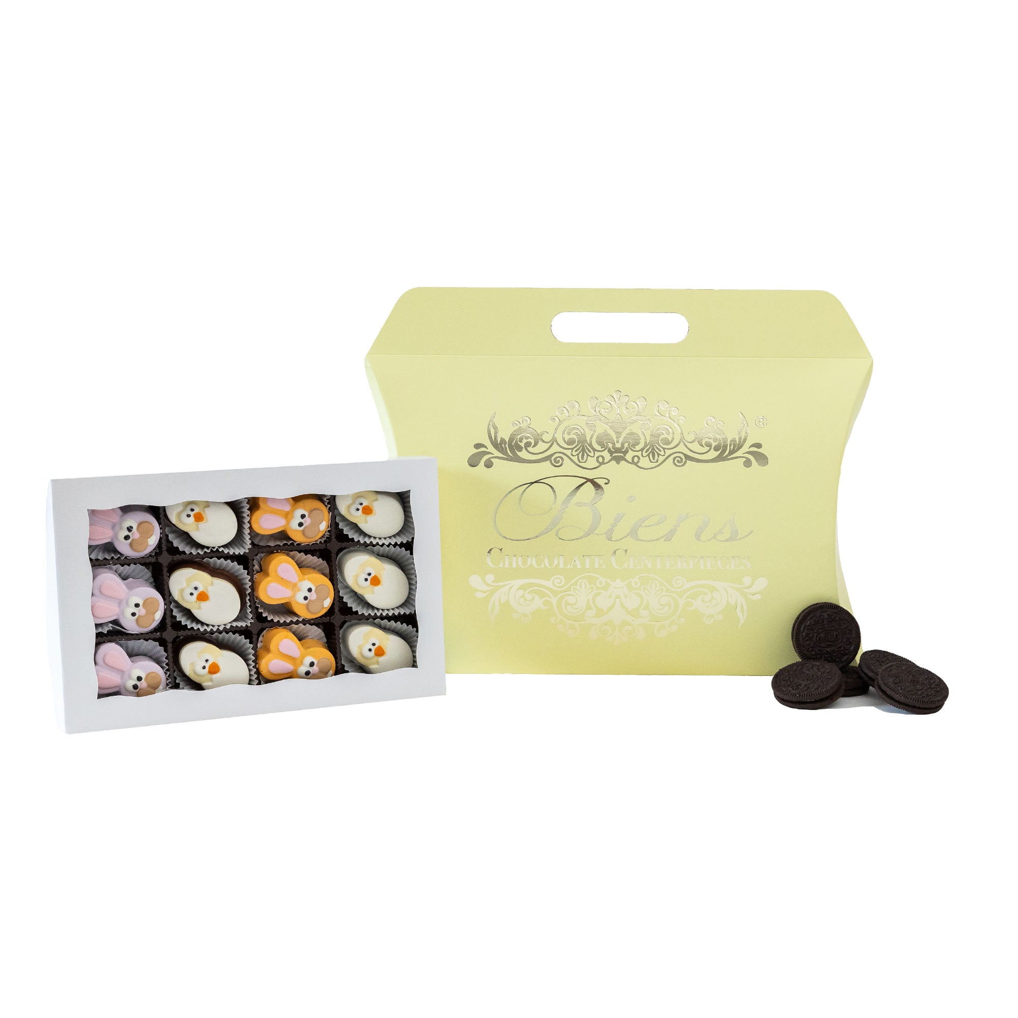 Welcome the joys of spring with our Easter Custom Oreo Purse Box, the perfect treat to celebrate the season. This delightful collection includes a dozen mini chocolate-covered Oreos, each one a work of art. Discover mini Oreos designed as hatching chicks and Easter bunnies capturing the essence of the holiday. Each Oreo is handcrafted to ensure a festive and delicious addition to your Easter basket. Indulge in the sweetest symbols of Easter with our specially designed chocolate collection.