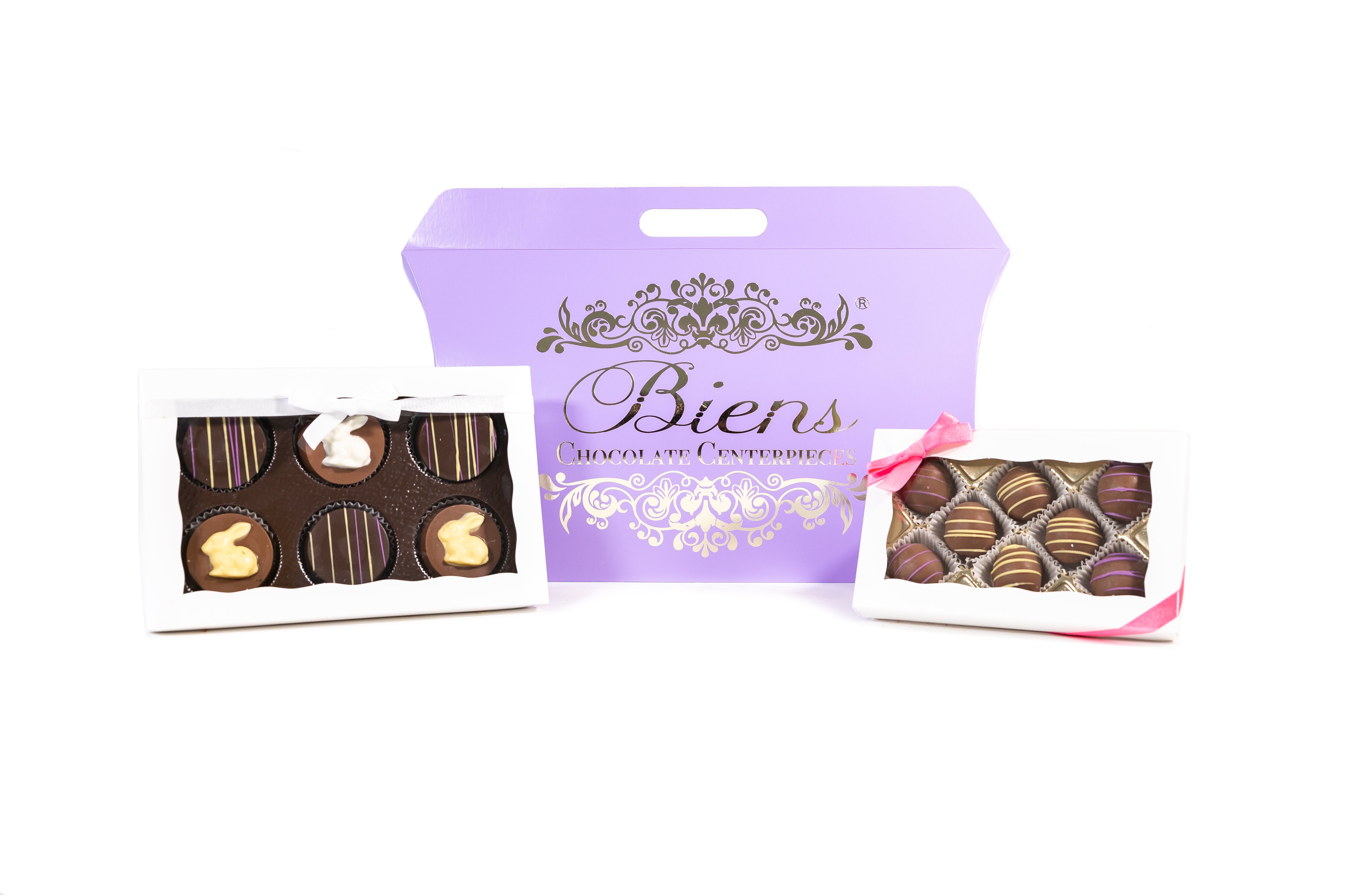 Bunny kisses and Easter wishes. Gather your friends and family around this beautiful tulip tote box this Easter. The tulip tote box includes a variety of our delicious chocolate treats to keep all your guests hoppy!